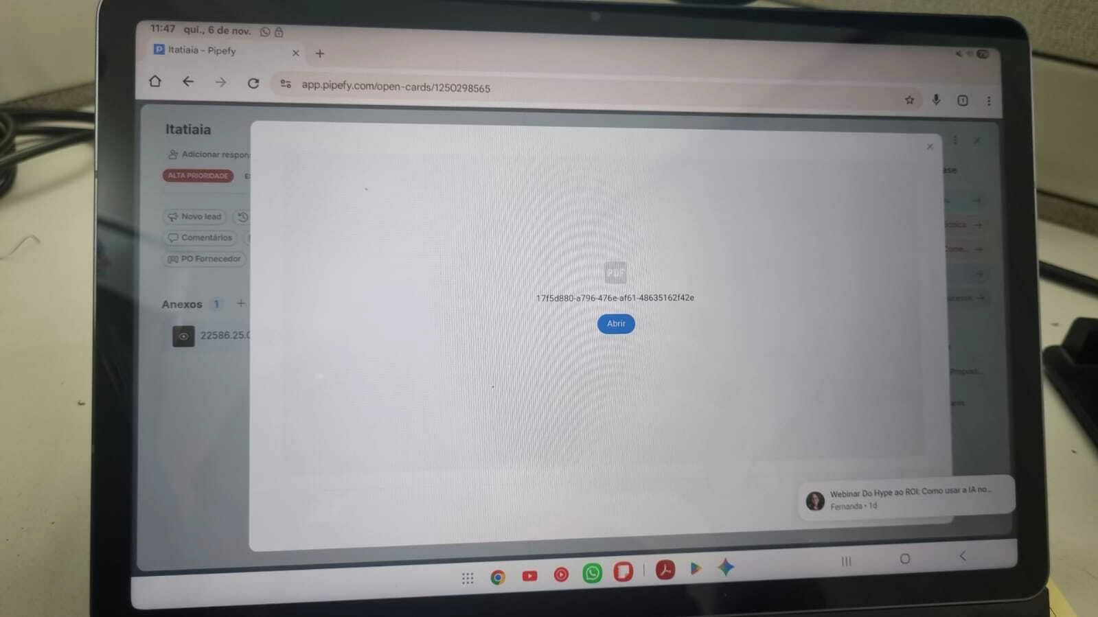 Issue: When clicking a PDF file in a Pipefy card using Chrome Beta 143 on Android 15, the browser forces a download/open dialogue instead of displaying the file directly in the tab (inline viewing). Diagnosis: Chrome's native PDF viewer is confirmed working (external PDFs open correctly). The Pipefy server is likely sending the HTTP header Content-Disposition: attachment, overriding the browser's native viewer. Request: Please remove the Content-Disposition: attachment header for PDF files to allow inline viewing on modern mobile browsers.