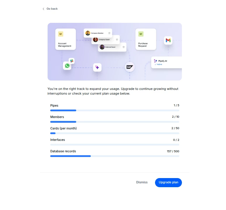 Não consigo mais acessar o único board que tenho pipefy, fica aparecendo essa tela e quando eu clico em dismiss volta pra página inicial e eu não estourei nenhum limite da conta gratuita pra precisar fazer o upgarde de plano.