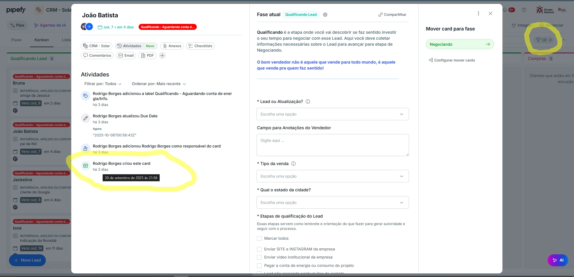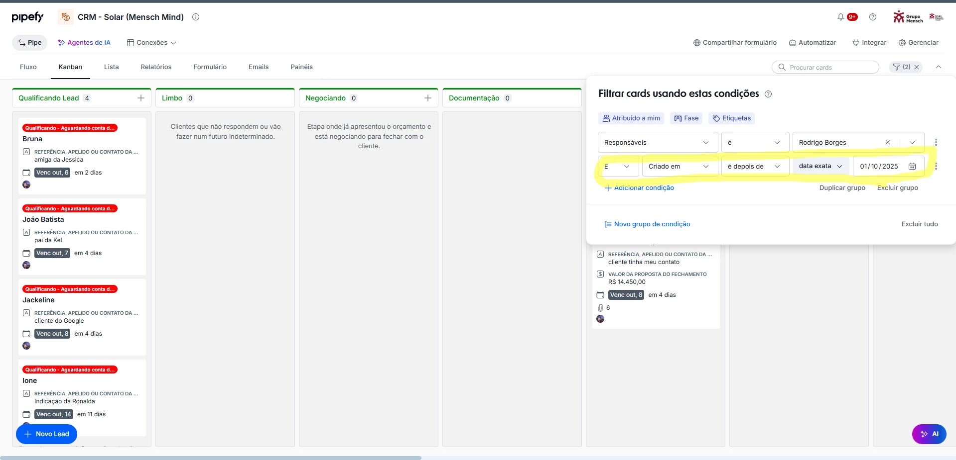 When I apply the filter on the pipe page, in the Kanban model, with the condition “Created after 10/01/2025”, it shows 6 total cards, but 2 of them were actually created on 09/30 around 10 PM. I believe this may be related to a time zone issue.