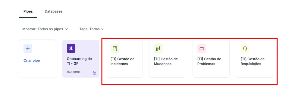 Alguns pipes de ITIL (Incidentes, Mudanças, Problemas e Requisições) foram criados automaticamente pelo sistema, e não são utilizados no nosso dia a dia. No entanto, esses pipes acabaram consumindo o limite permitido, o que resultou no bloqueio do único pipe que utilizamos ativamente, impactando diretamente nossa operação.