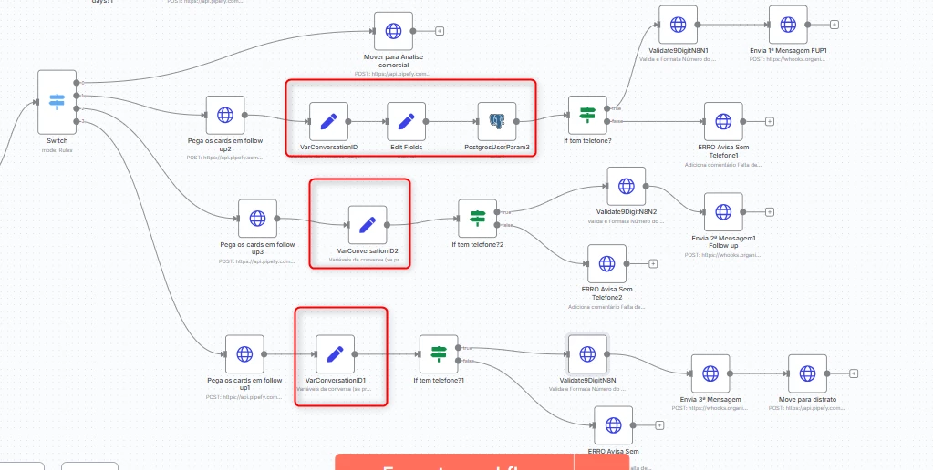 Na imagem acima, tenho um switch que tenho 4 condicionais, um caminho para a fase de analise comercial, outro caminho para pegar os cartões e envia mensagem no whatsapp, porém para que eu faça o envio do whatsapp precise consultar no postgresql, oque queria era não precisar da consulta do banco. A mesma coisa acontece nos caminhos 3 e 4 para não precisar usar o banco de dados, pois preciso pegar o conversationid para que cada mensagem seja enviado.