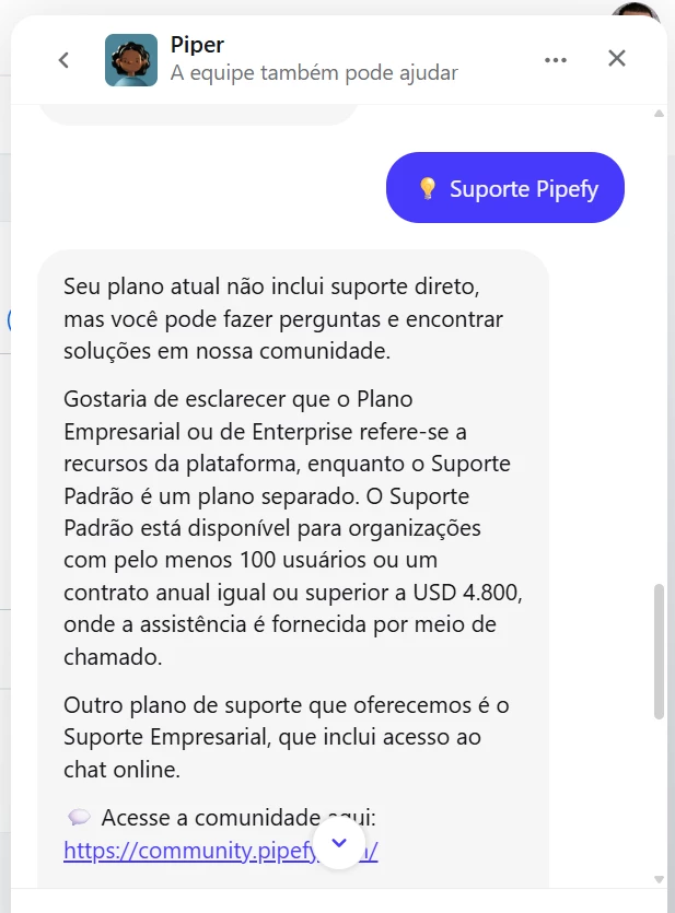 Estou tentando acionar o suporte pelo chat como de costume mas estou recebendo a informação de que meu plano não inclui suporte conforme print abaixo.