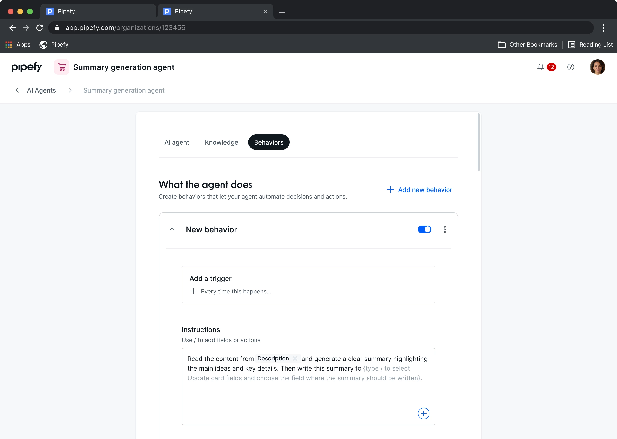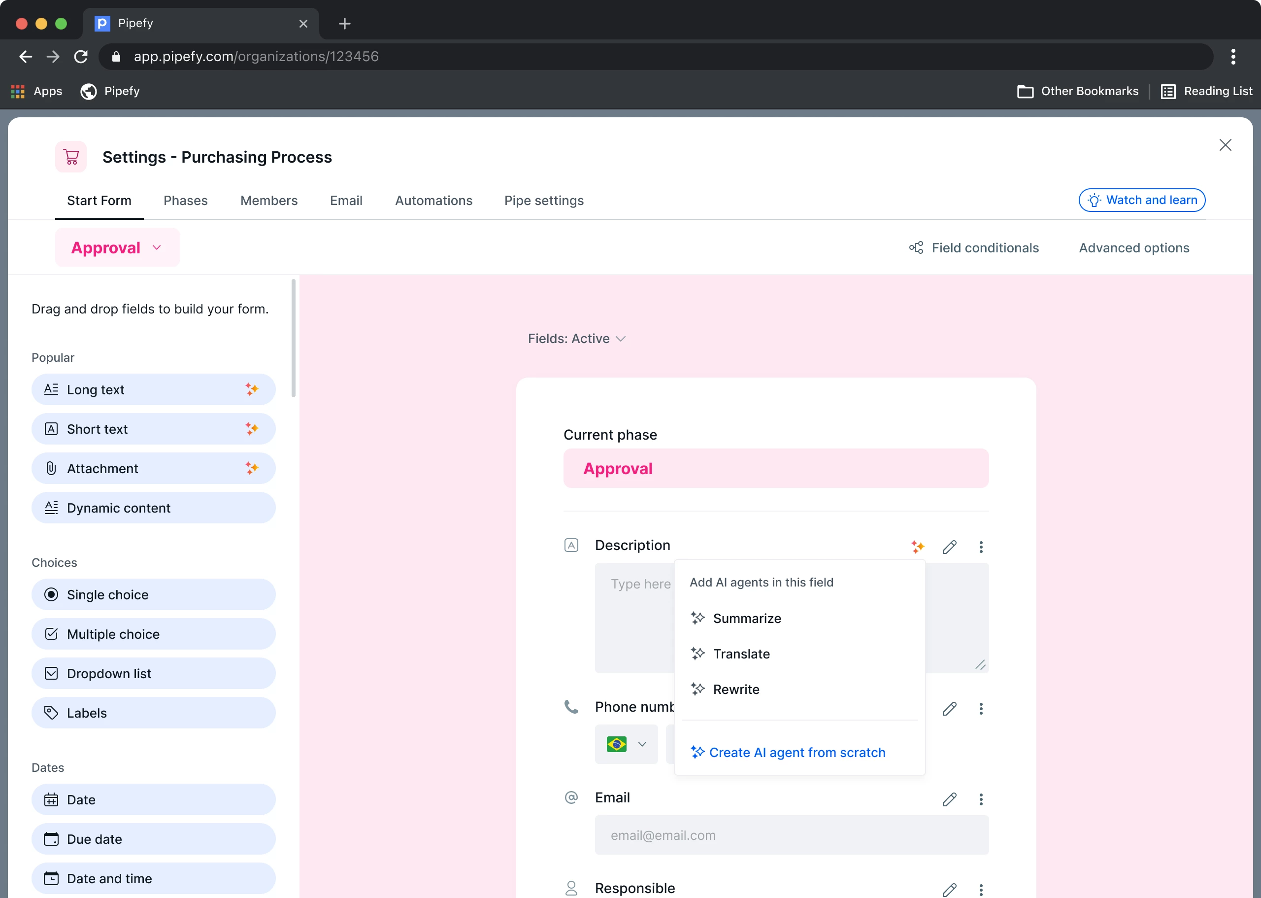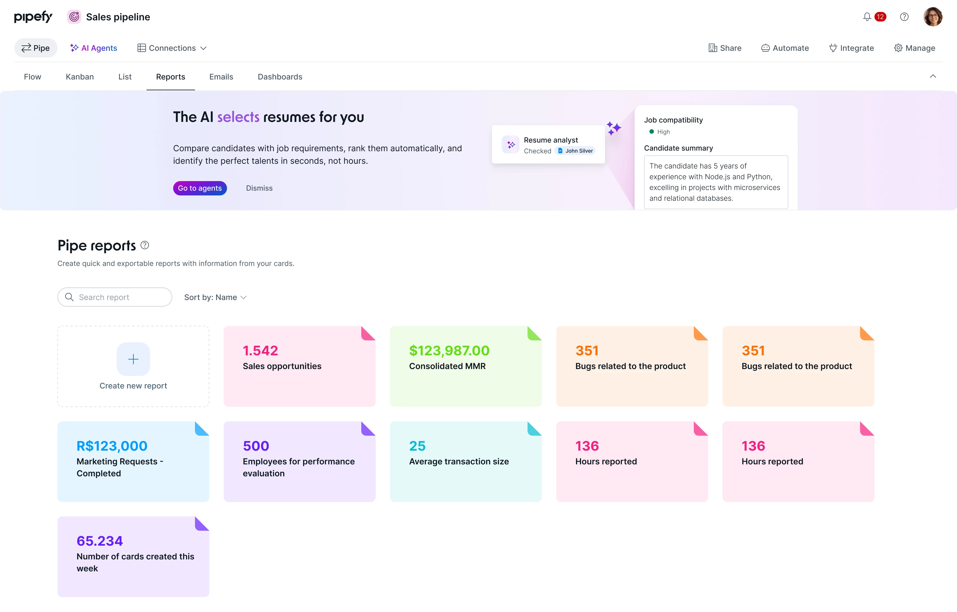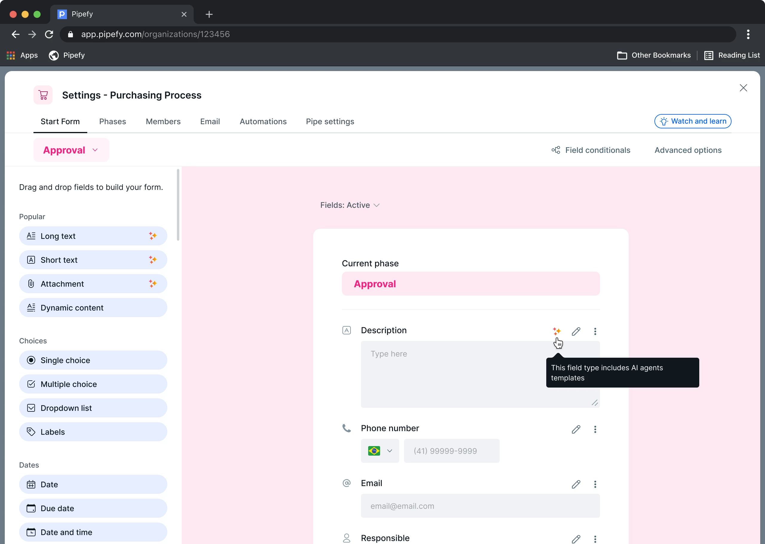 Lançamos um novo conjunto de templates de Agentes de IA diretamente nos campos, agora disponível para todos os admins do Pipefy.