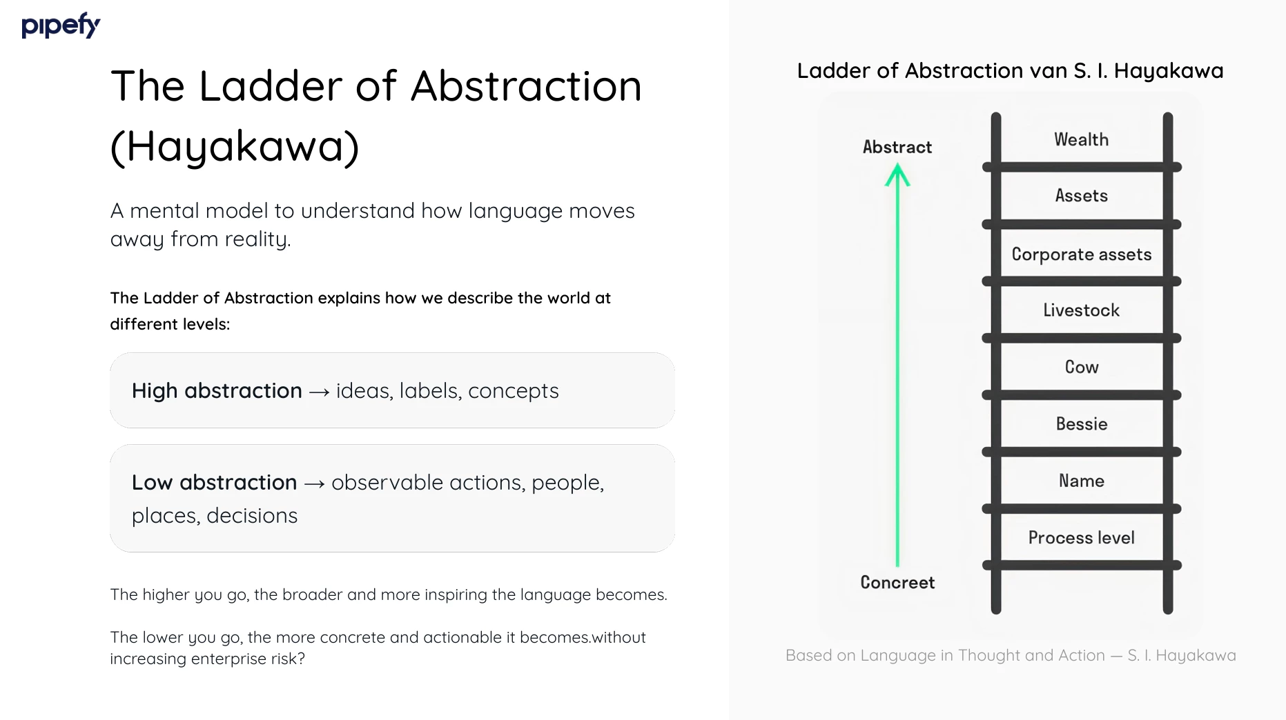 Um dos conceitos mais interessantes apresentados foi a “Escada da Abstração”, inspirado no modelo mental do linguista S. I. Hayakawa, que ilustra como nossa comunicação varia entre o concreto e o abstrato.