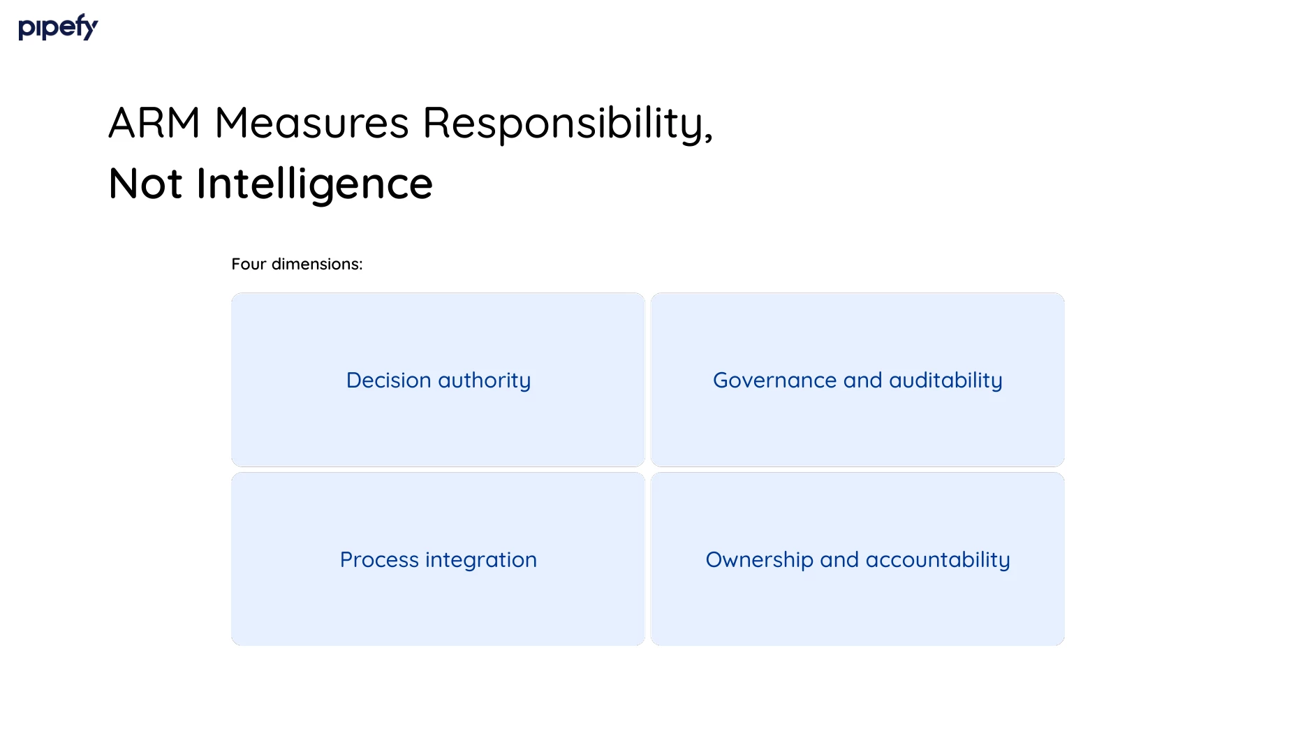 🎯 Basicamente, o ARM mede a responsabilidade da operação, e não apenas a inteligência do modelo. Ele avalia quatro dimensões críticas antes de qualquer delegação: autoridade de decisão, governança, integração de processos e accountability (prestação de contas).