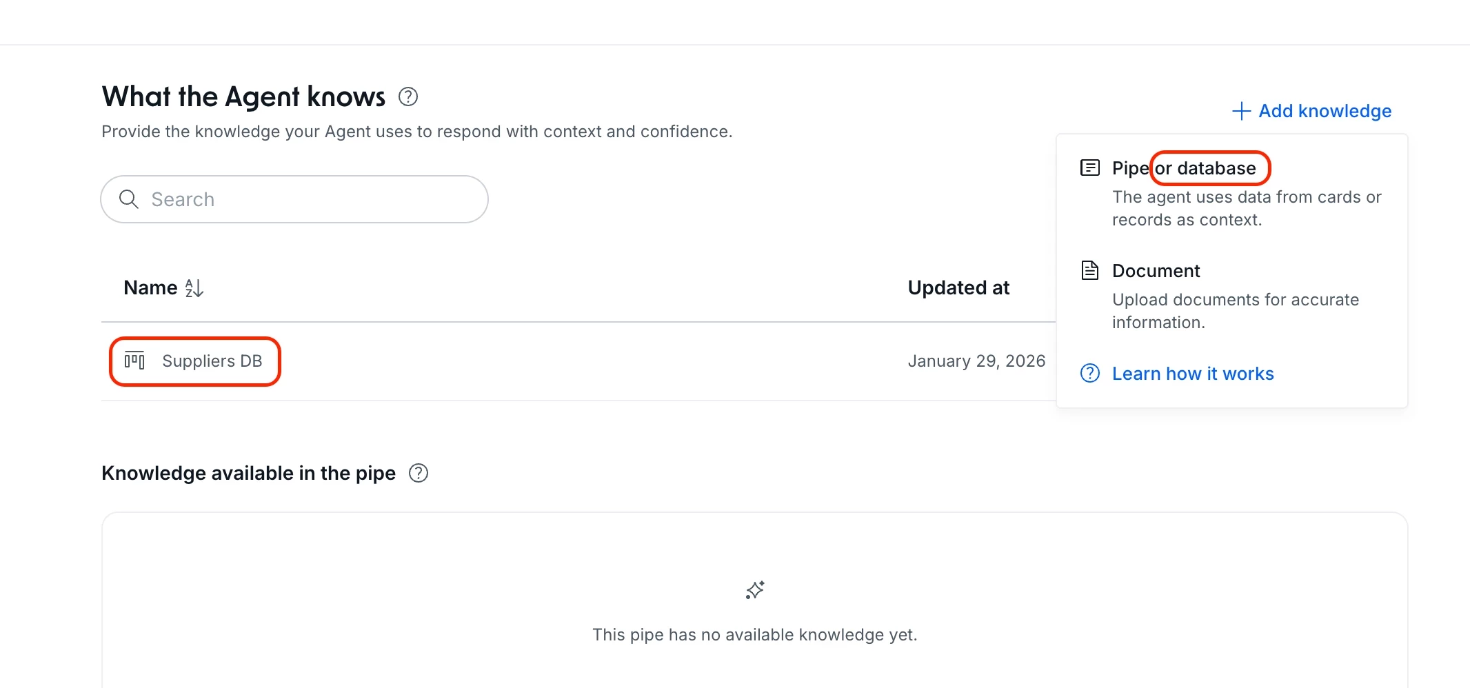 Now, in addition to Pipes data and documents, AI Agents can also use Databases as a knowledge base. This allows agents to query centralized records to answer questions and perform actions with more context and precision.